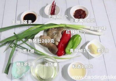 步骤1准备食材:熟猪肚200克、青蒜2棵、干辣椒2个、青辣椒1个、红辣椒1个、豆瓣酱1茶匙、生抽1茶匙、料酒1茶匙、糖1茶匙、小葱1根、姜1块、油适量 。步骤2猪肚切丝 。步骤3青蒜切斜段 。步骤4青辣椒切丝 。步骤5红辣椒切丝 。步骤6干...