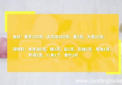 步骤1食材:香芋200克、五花肉300克、姜2克、大葱10克调味料:食用油5克、糖3克、盐1克、生抽2克、老抽1克、料酒2克、八角1个、香叶1片步骤2香芋切滚刀块。步骤3姜切片。步骤4葱切段。步骤5五花肉切方块 。步骤6热锅倒油,油温4成热...