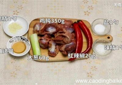 步骤1食材准备:鸡肫350g、大葱60g、红辣椒20g、盐1勺、味精1勺、鸡精1勺、香油适量 。步骤2锅中加入适量清水,烧开然后放入鸡肫煮25分钟,捞出放凉 。步骤3鸡肫切成薄片待用 。步骤4将洗净的大葱切成葱丝 。步骤5红辣椒去籽,切成细...