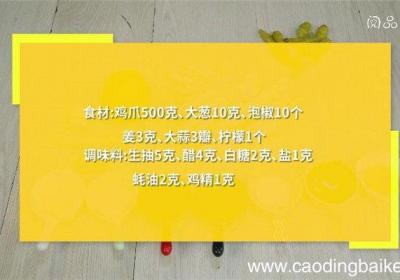 步骤1食材:鸡爪500克、大葱10克、泡椒10个、姜3克、大蒜3瓣、柠檬1个调味料:生抽5克、醋4克、白糖2克、盐1克、蚝油2克、鸡精1克步骤2大葱切段 。步骤3姜切片 。步骤4大蒜切末 。步骤5柠檬切片 。步骤6泡椒切小段 。步骤7鸡爪冷...