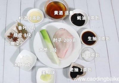 步骤1准备食材:肘子200克、大葱1段、桂皮1块、姜1块、八角2个、香叶2片、老抽1茶匙、盐1茶匙、生抽1茶匙、黄酒适量、料酒1茶匙 。步骤2肘子洗净打上花刀,浸泡1小时去除血水 。步骤3大葱切段 。步骤4姜切片 。步骤5锅中倒入适量水,放...