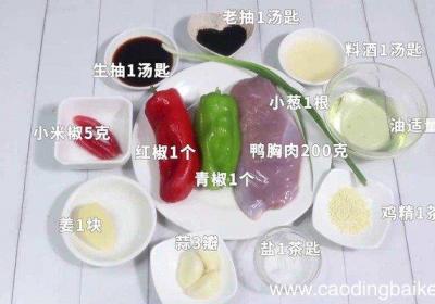 步骤1准备食材:鸭胸肉200克、姜1块、蒜3瓣、小米椒5克、盐1茶匙、生抽1汤匙、老抽1汤匙、料酒1汤匙、鸡精1茶匙、油适量、小葱1根、青椒1个、红椒1个 。步骤2鸭胸肉切片 。步骤3姜切片 。步骤4小米椒切圈 。步骤5蒜切片 。步骤6小葱...