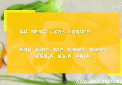步骤1食材:鸭500克、小葱2根、上海青100克 。调味料:香油3克、盐2克、胡椒粉2克、花椒粉2克、辣椒粉2克、酱油3克、鸡精1克 。步骤2上海青对半切开,放入沸水锅中焯烫40秒,捞出备用 。步骤3鸭去除内脏,将鸭身里外均匀抹上盐、1克胡...