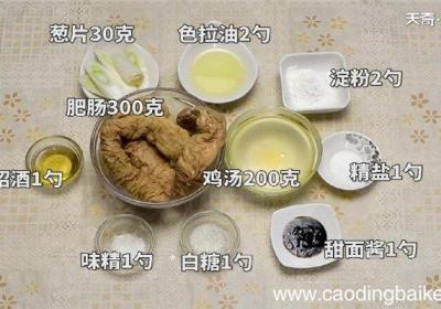 步骤1食材准备:肥肠300克、葱片30克、精盐1勺、味精1勺、白糖1勺、绍酒1勺、淀粉2勺、甜面酱1勺、色拉油2勺、鸡汤200克 。步骤2将煮熟洗净的肥肠,切成菱形块,装入碗中备用 。步骤3锅中倒入适量油,油温四成热后放入甜面酱炒香,再加入...