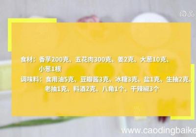 【香芋红烧肉的做法 香芋红烧肉怎么做】步骤1食材:香芋200克、五花肉300克、姜2克、大葱10克、小葱1根调味料:食用油5克、豆瓣酱3克、冰糖3克、盐1克、生抽2克、老抽1克、料酒2克、八角1个、干辣椒3个步骤2香芋切滚刀块 。小葱切葱花...