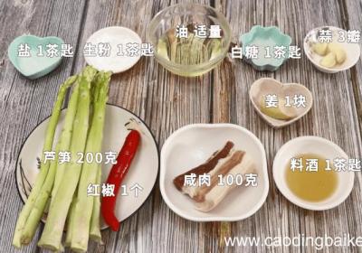 步骤1准备食材:咸肉100克、芦笋200克、白糖1茶匙、生粉1茶匙、红椒1个、蒜3瓣、姜1块、盐1茶匙、油适量、料酒1茶匙 。【芦笋咸肉 芦笋咸肉怎么做好吃】步骤2咸肉洗净切片 。步骤3芦笋洗净切斜片 。步骤4红椒切片 。步骤5蒜切片 。步...