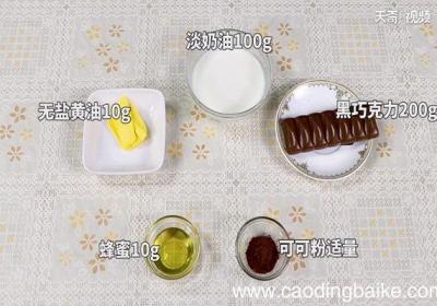 步骤1准备食材:黑巧克力200g、淡奶油100g、蜂蜜10g、无盐黄油10g、可可粉适量 。步骤2将淡奶油倒入锅中,然后加入蜂蜜,用大火煮沸 。步骤3将巧克力倒入锅中,搅拌至融化 。步骤4将锅离火,加入黄油,搅拌均匀,放在装有热水的盆中进一...