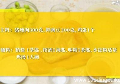步骤1准备食材:猪瘦肉200克、鲜豌豆200克、鸡蛋1个、精盐1茶匙、绍酒1汤匙、味精1茶匙、淀粉适量、鸡汤1大碗步骤2将猪瘦肉剁成肉泥, 。步骤3再加入绍酒、鸡蛋清、精盐、味精、搅匀备用 。步骤4锅中加入鸡汤烧至温热,将肉泥挤成丸子 。步...