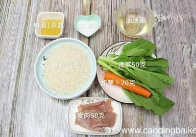 步骤1准备食材:青菜50克、瘦肉50克、大米50克、胡萝卜20克、盐1茶匙、油适量、料酒1茶匙 。步骤2青菜洗净切碎 。步骤3瘦肉洗净切粒 。步骤4大米洗净 。【青菜瘦肉粥 青菜瘦肉粥的做法】步骤5胡萝卜洗净切末 。步骤6首先锅内倒少许油,...
