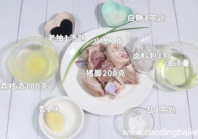 步骤1准备食材:猪脚200克、荔枝酒100克、卤料包1包、姜1块、盐1茶匙、老抽1汤匙、白糖1茶匙、小葱1根、油适量步骤2猪脚提前让老板剁成块 。步骤3小葱切葱花 。步骤4姜切片 。步骤5猪脚焯好后洗净备用 。步骤6起锅倒油,油热加入姜片爆...