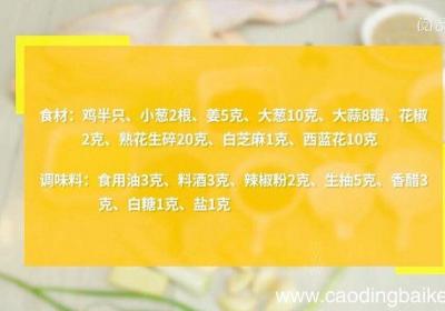 步骤1食材:鸡半只、小葱2根、姜5克、大葱10克、大蒜8瓣、花椒2克、熟花生碎20克、白芝麻1克、西蓝花10克 。调味料:食用油3克、料酒3克、辣椒粉2克、生抽5克、香醋3克、白糖1克、盐1克 。步骤2西蓝花掰成小朵,放入沸水锅中焯烫30秒...