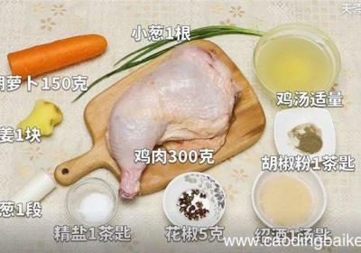 步骤1准备食材:鸡肉300克、胡萝卜150克、大葱1段、小葱1根、姜1块、花椒10粒、精盐1茶匙、胡椒粉1茶匙、绍酒2汤匙、鸡汤适量步骤2姜切片,大葱切段,小葱切成葱花,将胡萝卜洗净切成滚刀块 。步骤3将鸡肉洗净剁成块,再用沸水焯烫一下,捞...