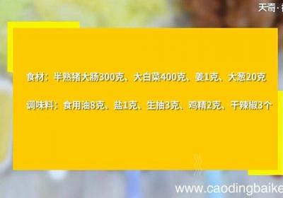 步骤1食材:半熟猪大肠300克、大白菜400克、姜1克、大葱20克调味料:食用油8克、盐1克、生抽3克、鸡精2克、干辣椒3个步骤2半熟猪大肠切段 。步骤3大白菜切块 。步骤4姜切片 。步骤5大葱切片 。步骤6干辣椒切断 。步骤7热锅倒油,油...