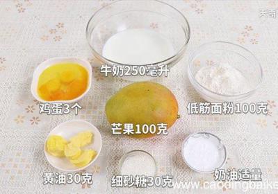 步骤1配料:低筋面粉100g、黄油30g、细糖30g、牛奶250ml、芒果100克、鸡蛋3个、奶油适量步骤2碗中加入鸡蛋,再倒入细砂糖,然后搅拌均匀 。步骤3蛋液里加入面粉,搅拌,再加入融化好的黄油,加入牛奶,搅拌均匀,最后再用过滤网过滤一...