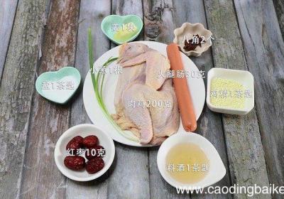 发布时间: 12小时前步骤1准备食材:肉鸡200克、小葱1根、姜1块、八角2个、盐1茶匙、鸡精1茶匙、料酒1茶匙、火腿肠30克、红枣10克【清炖鸡怎么炖好吃 清炖鸡的做法】 步骤2鸡洗净剁块 。步骤3小葱切葱花 。步骤4姜切片 。步骤5火腿肠切片 。步骤6红枣去...