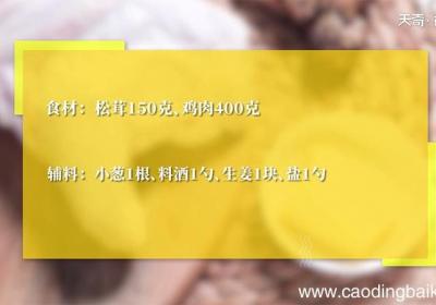 发布时间: 12小时前步骤1食材:松茸150克,鸡肉400克、小葱1根、料酒1勺、生姜1块、盐1勺 。步骤2松茸加入清水清洗 。用剪刀剪掉底部,抓洗干净后沥干 。步骤3将松茸切片 。步骤4鸡肉洗净后切块 。步骤5将鸡肉放入锅中焯水,加入料酒1勺,撇去血沫,捞出沥...