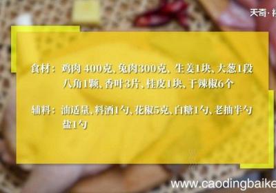 发布时间: 11小时前步骤1食材:鸡肉400克、兔肉300克、 生姜1块、大葱 1段、八角1颗、香叶3片、桂皮1块、干辣椒6个 。辅料:油适量、料酒1勺、花椒5克、白糖1勺、老抽半勺、盐1勺 。步骤2兔肉剁小块,锅中清水烧开,放入兔肉,焯水两分钟后,捞出沥干 。...