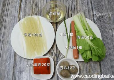 步骤1准备食材:米线100克、青菜50克、小葱1根、牛肉丸20克、火腿肠1根、火锅底料20克、油适量 。步骤2米线泡软备用 。步骤3青菜洗净切段 。步骤4小葱切葱花 。步骤5牛肉丸切块 。步骤6火腿肠切段 。步骤7首先起锅烧油,放入火锅底料...