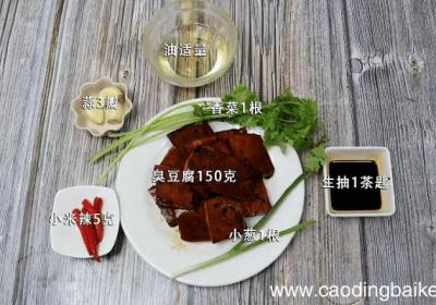 步骤1准备食材:臭豆腐150克、小葱1根、蒜3瓣、香菜1根、小米辣5克、生抽1茶匙、油适量 。步骤2小葱切葱花 。步骤3蒜切末 。步骤4香菜切末 。步骤5小米辣切圈 。步骤6首先起锅烧油,下入臭豆腐炸至发泡,捞出备用 。步骤7然后锅内倒入少...