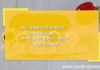步骤1食材:海藻菜200克,红椒20克,干果10克,蒜2瓣调味料:盐1克,生抽1克,香油2克,醋1克,白芝麻3克步骤2海藻用沸水涮洗2次,放入碗中,备用 。步骤3红椒切丝 。步骤4蒜切末 。【彩椒干果拌海藻菜怎么做 彩椒干果拌海藻菜的做法】...