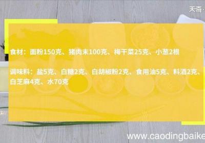 步骤1食材:面粉150克,猪肉末100克、梅干菜25克、小葱2根调味料:盐5克、白糖2克、白胡椒粉2克、食用油5克、料酒2克、白芝麻4克、水70克步骤2梅干菜切碎、小葱切碎 。步骤3面粉、放入70克清水、3克盐,揉匀,加保鲜膜,醒30分钟...