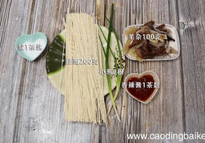 步骤1准备食材:羊杂100克、 挂面200克、小葱1根 、 盐1茶匙、香辣酱1茶匙 。步骤2羊杂洗净切碎 。步骤3小葱切葱花 。步骤4首先起锅烧水,放入羊杂碎焯水2分钟,捞出备用 。步骤5然后锅中倒入适量清水,放入香辣酱大火烧开,再放入羊杂...