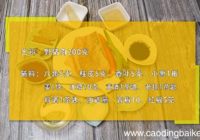 步骤1准备食材:野猪肉200克、八角5克、桂皮5克、香叶5克、小葱1根、姜1块、冰糖10克、黄酒1茶匙、老抽1茶匙、料酒1茶匙、油适量、青椒10、红椒5克 。【野猪肉的做法 野猪肉的做法】步骤2猪肉洗净切小块 。步骤3小葱切葱花 。步骤4姜...