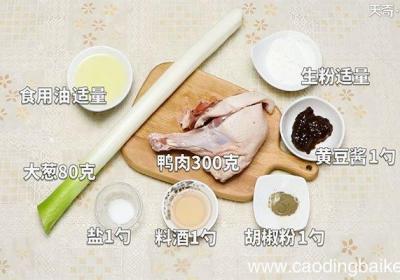 步骤1准备食材:鸭肉300克、大葱80克、盐1勺 、料酒1勺 、胡椒粉1勺 、生粉适量、黄豆酱1勺 、食用油适量。步骤2葱切段 。步骤3【葱爆鸭块的做法 如何做葱爆鸭块】然后再把葱切丝 。步骤4鸭肉切块 。步骤5鸭肉里加入料酒,盐,胡椒粉,...