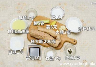 步骤1准备食材:猪大肠200克、食盐1勺、酱油1勺、醋1勺、味精1勺、葱5克、姜5克、花椒5克、大蒜2瓣、白糖1勺、食用油适量、淀粉适量。步骤2葱切末 。步骤3姜切末 。步骤4蒜切片 。步骤5花椒加热水浸泡 。步骤6煮熟的肥肠切成1厘米长的...
