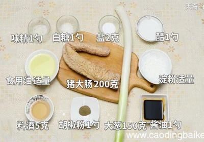 发布时间: 3小时前步骤1准备食材:猪大肠200克、大葱150克、盐2克、酱油1勺、醋1勺、味精1勺、料酒5克、白糖1勺、食用油适量、胡椒粉1勺、淀粉适量 。步骤2葱切长片 。步骤3将猪肠放入加水的锅中 。步骤4锅里加盐2克,料酒5克,葱少许,用小火烧制 。步...