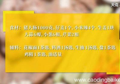 步骤1食材:猪大肠1000克、嫩姜1个、小米辣4个、生姜1块、大蒜6瓣、小葱6根、芹菜2根 。辅料:花椒面2茶匙、料酒2汤匙、生抽1汤匙、醋半汤匙、盐1茶匙、鸡精1茶匙 。步骤2西芹切小段 。步骤3小葱切长段 。步骤4大蒜切末 。步骤5姜切...