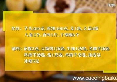 步骤1食材:芋头200克、鸡翅400克、姜1块、大蒜4瓣、八角2个、香叶1片、干辣椒6个 。辅料:花椒2克、豆瓣酱1汤匙、生抽1汤匙、老抽半汤匙、料酒半汤匙、盐1茶匙、鸡精半茶匙、油适量、冰糖5克 。步骤2香芋切块 。步骤3姜切片 。步骤4...