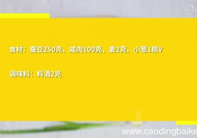 步骤1准备食材:蚕豆250克,咸肉100克,姜2克,小葱1根、料酒2克 。步骤2蚕豆洗净 。步骤3咸肉洗净 。【蚕豆蒸咸肉 蚕豆蒸咸肉的做法】步骤4咸肉切片 。步骤5姜切末 。步骤6小葱切葱花 。步骤7咸肉铺入碗中、步骤8再放入蚕豆 。步骤...