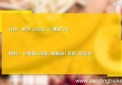 步骤1食材:酸笋200克,干辣椒3个 。辅料:豆瓣酱1汤匙,辣椒面1茶匙,油适量 。步骤2酸笋加入适量清水洗净 。步骤3干辣椒切段 。步骤4炒锅倒油,下入辣椒面、放入豆瓣酱1勺,炒出红油 。步骤5下入酸笋丝翻炒 。步骤6倒入干辣椒段 。步骤...