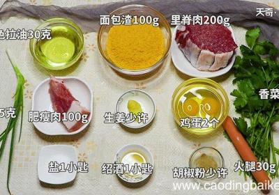 步骤1准备食材:里脊肉200g、面包渣100g、肥瘦肉100g、火腿30g、鸡蛋2个、香菜50克、小葱5克、生姜少许、胡椒粉少许、盐1小匙、绍酒1大匙、色拉油30克 。步骤2首先将鸡蛋的蛋清与蛋黄分离,再把蛋黄打散,备用 。步骤3里脊肉洗净...