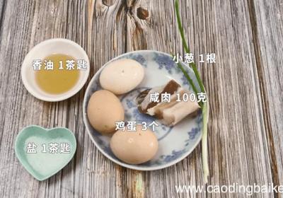 步骤1准备食材:咸肉100克、鸡蛋3个、小葱1根、盐1茶匙、香油1茶匙 。步骤2咸肉洗净剁成末 。步骤3鸡蛋打入碗中搅散 。步骤4【咸肉蒸蛋 咸肉蒸蛋怎么做好吃】鸡蛋打入碗中搅散 。步骤5鸡蛋碗中放入咸肉、盐,搅拌均匀,然后加适量清水继续搅...