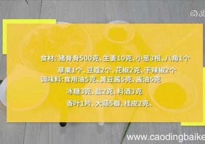 【酱骨架 酱骨架的做法】步骤1食材:猪脊骨500克、生姜10克、小葱3根、八角1个、草果1个、豆蔻2个、花椒2克、干辣椒2个调味料:食用油5克、黄豆酱5克、酱油5克、冰糖3克、盐2克、料酒3克、香叶1片、大蒜5瓣、桂皮2克、步骤2锅中倒入清...
