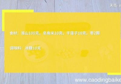 步骤1食材:淮山100克、皂角米10克、干莲子10克、枣2颗调味料:冰糖10克 。步骤2淮山去皮,切段,皂角米用清水浸泡3小时 。步骤3锅中放入皂角米、干莲子,加入600毫升清水,炖煮90分钟,加入淮山、枣、冰糖,再煮30分钟,盛出 。【淮...