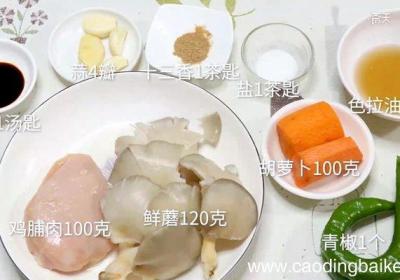 步骤1准备食材:鲜蘑120克、鸡脯肉100克、胡萝卜100克、青椒1个、蒜4瓣、十三香1茶匙、酱油1汤匙、盐1茶匙、色拉油适量 。步骤2蒜切末 。步骤3鲜蘑撕成条 。步骤4青椒切块 。步骤5胡萝卜切片 。步骤6鸡脯肉切丁 。步骤7鲜蘑用清水...