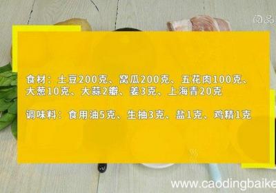 步骤1食材:土豆200克、窝瓜200克、五花肉100克、大葱10克、大蒜2瓣、姜3克、上海青20克、食用油5克、生抽3克、盐1克、鸡精1克 。步骤2上海青对半切开 。步骤3放入沸水锅中,焯烫30秒,捞出备用 。步骤4土豆去皮,切块 。步骤5...