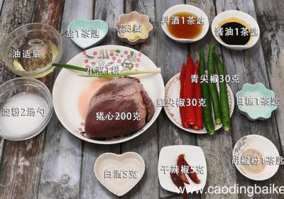 步骤1准备食材:猪心200克、油适量、盐1茶匙、蒜3瓣、料酒1茶匙、酱油1茶匙、水淀粉2汤勺、红尖椒30克、青尖椒30克、白糖1茶匙、小葱1根、胡椒粉1茶匙、干辣椒5克、白酒5克 。步骤2猪心洗净切片 。步骤3蒜切片 。步骤4红尖椒切片 。...