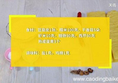 步骤1食材:豆腐皮1张、糯米100克、干香菇5朵、虾米10克、腊肠50克、西芹50克、熟咸蛋黄3个调味料:盐1克、鸡精1克步骤2干香菇用清水泡发30分钟,捞出,切小丁步骤3糯米用清水浸泡12小时步骤4腊肠切小丁,西芹切小?。好子们逅莘?...
