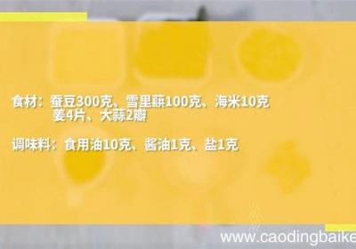 步骤1准备食材:蚕豆300克、雪里蕻100克、海米10克、姜4片、大蒜2瓣、食用油10克、酱油1克、盐1克 。步骤2雪里蕻先浸泡两个小时,捞出,捏去水分切成小段 。步骤3将蚕豆洗净,沥干水分 。步骤4热锅倒入5克油,油温5成热时下蚕豆,炒香...
