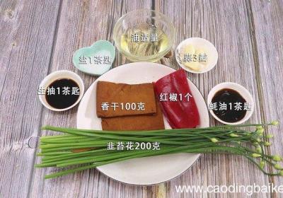 步骤1准备食材:韭苔花200克、香干100克、油适量、盐1茶匙、红椒1个、生抽1茶匙、蒜3瓣、蚝油1茶匙 。步骤2韭苔花洗净切段 。步骤3香干洗净切条 。步骤4蒜切片 。步骤5红椒切丝 。步骤6起锅倒油,油热加入蒜片爆香 。步骤7然后加入香...