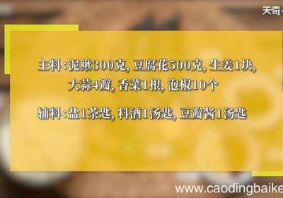 步骤1所需食材:泥鳅300克,豆腐花500克,生姜1块,大蒜4瓣,香菜1根,泡椒10个 。所需调料:盐1茶匙,料酒1汤匙,豆瓣酱1汤匙 。步骤2泥鳅沿骨切开,去头去骨 。步骤3泡椒切碎 。步骤4生姜切末 。步骤5蒜切末 。步骤6香菜切段 。...