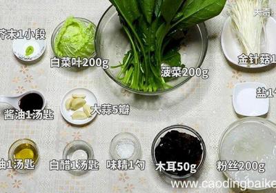 步骤1准备食材:菠菜200g、白菜叶200g、粉丝200g、金针菇100g、木耳50g、大蒜5瓣、花椒油1汤匙、芥末1小段、盐1勺、味精1勺、酱油1汤匙、白醋1汤匙 。步骤2首先将泡发的木耳切成丝 。步骤3大蒜切末 。步骤4菠菜叶、白菜叶,...