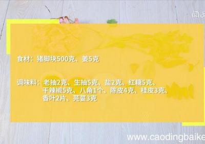 步骤1食材:猪脚块500克,姜5克调味料:老抽2克,生抽5克,盐2克,红糖5克,干辣椒5克,八角1个,陈皮4克,桂皮3克,香叶2片,芫荽3克【潮州卤猪脚的做法 潮州卤猪脚】步骤2猪脚块洗净,沥干备用 。步骤3锅中水沸后,加入老抽、生抽、盐、...