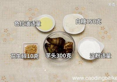 步骤1准备食材:芋头300克、花生碎10克、淀粉适量、白糖150克、色拉油适量 。步骤2首先将洗净的芋头去皮,切成粗小块,装入碗中 。步骤3芋头中加入淀粉,搅拌均匀 。步骤4坐锅点火,倒油烧热,油温6成热后放入芋头块,炸至表面呈金黄色,捞出...
