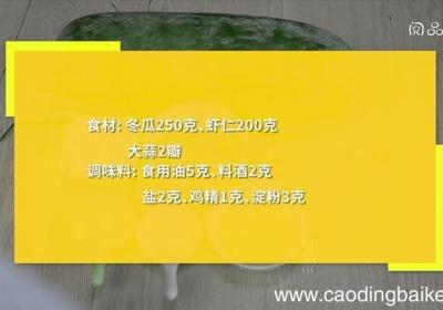 步骤1食材:冬瓜250克、虾仁200克、小葱1根、大蒜2瓣调味料:食用油5克、料酒2克、盐2克、鸡精1克、淀粉3克步骤2冬瓜切片 。步骤3大蒜切末 。步骤4虾仁加入料酒、淀粉,拌匀,腌制10分钟 。步骤5炒锅中油温5成热时,下入虾仁,炒至变...