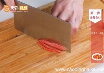 1.胡萝卜洗净切丝,鸡蛋磕入碗中,放入盐半勺打散 。2.锅中放入适量油,油温烧至7成热,倒入蛋液快速滑熟,盛出待用 。3.锅中留底油,放入胡萝卜丝炒至断生,放入鸡蛋炒匀,加入盐半勺翻炒均匀盛出即可 。【胡萝卜炒鸡蛋的做法】...